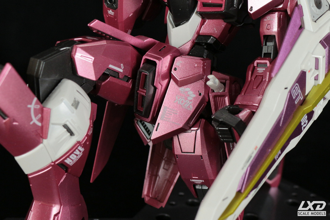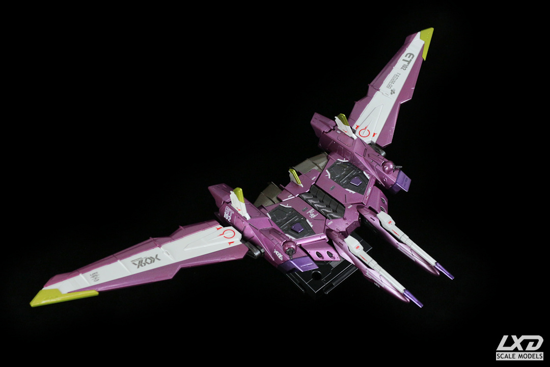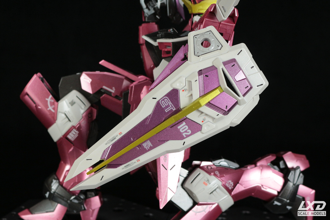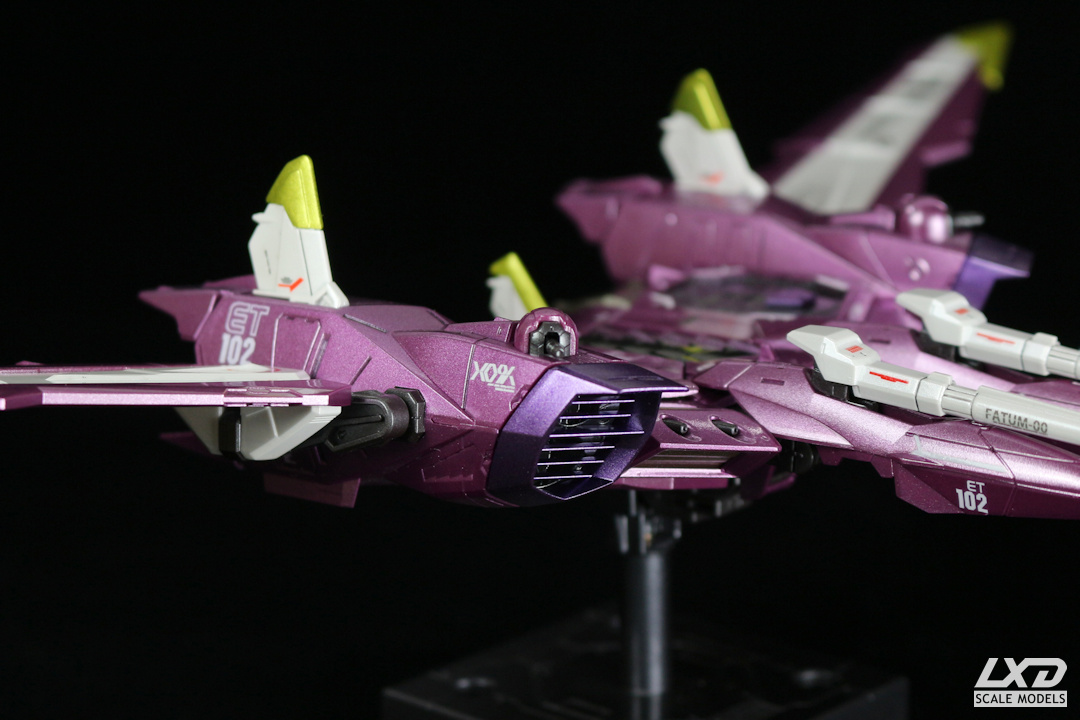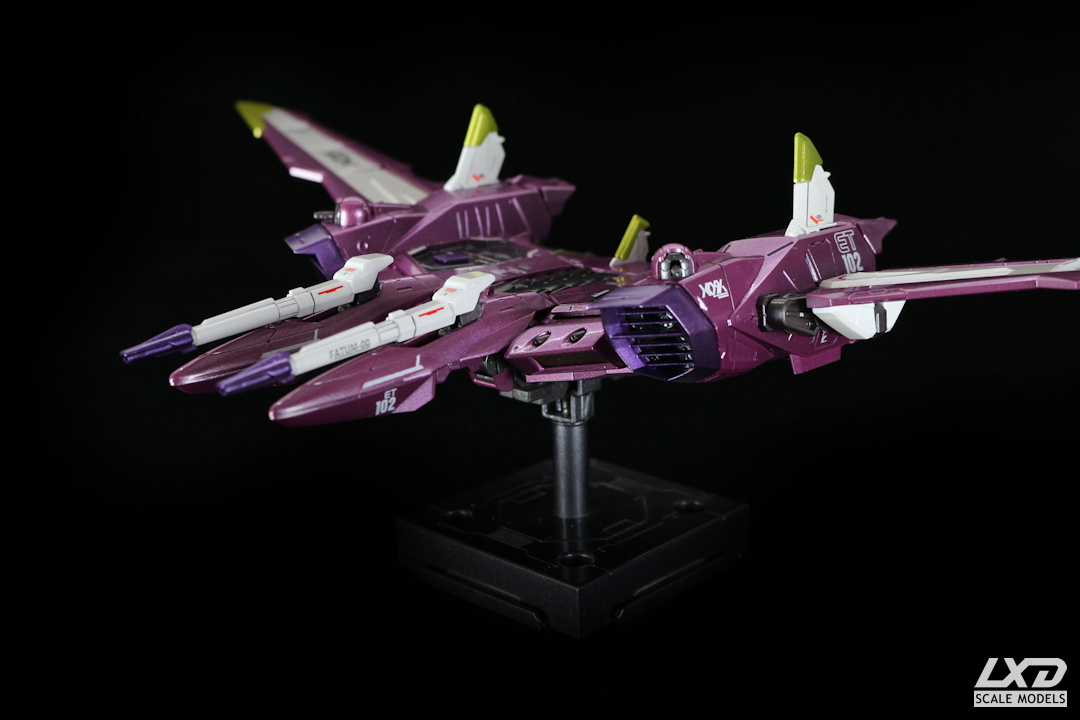 Justice Gundam (aus "Mobile Suit Gundam SEED") ist der letzte des Dreigestirns aus metallic-lackierten Gundams. Der Metallic-Effekt kommt bei den Magenta- und Violett-Tönen von Justice besonders gut zur Geltung. Fatum-00, der Carrier von Justice, den der Gundam normalerweise zusammengeklappt auf seinem Rücken trägt, habe ich als eigenständiges Modell dargestellt.