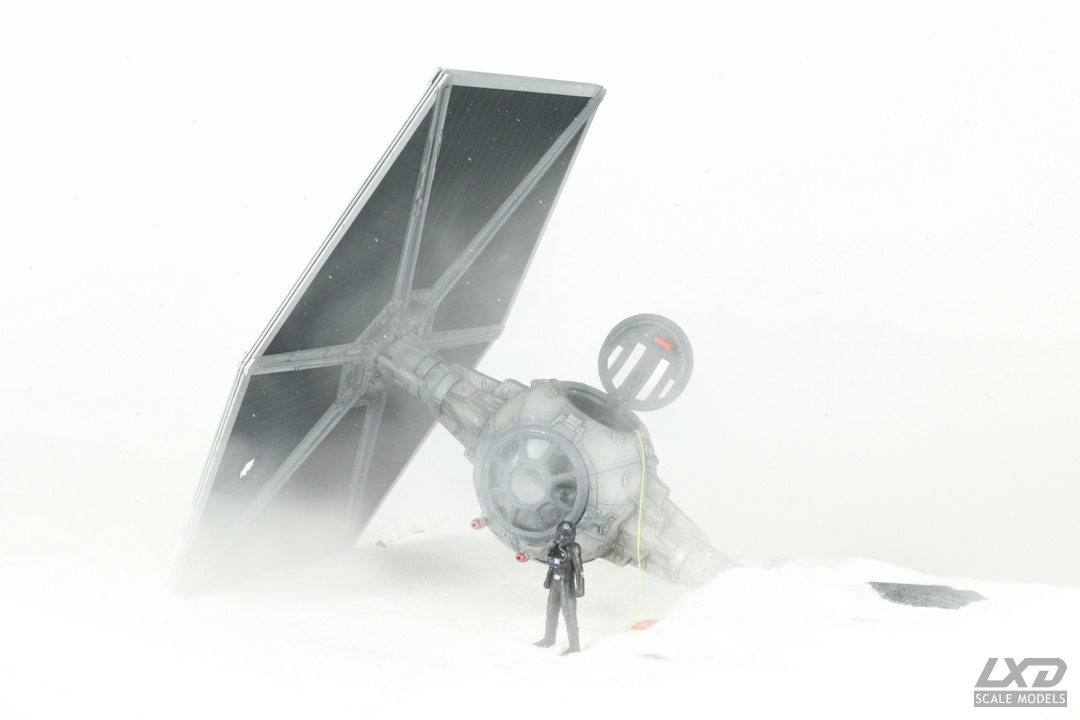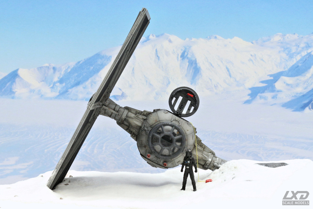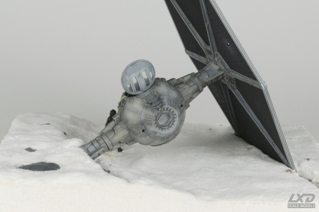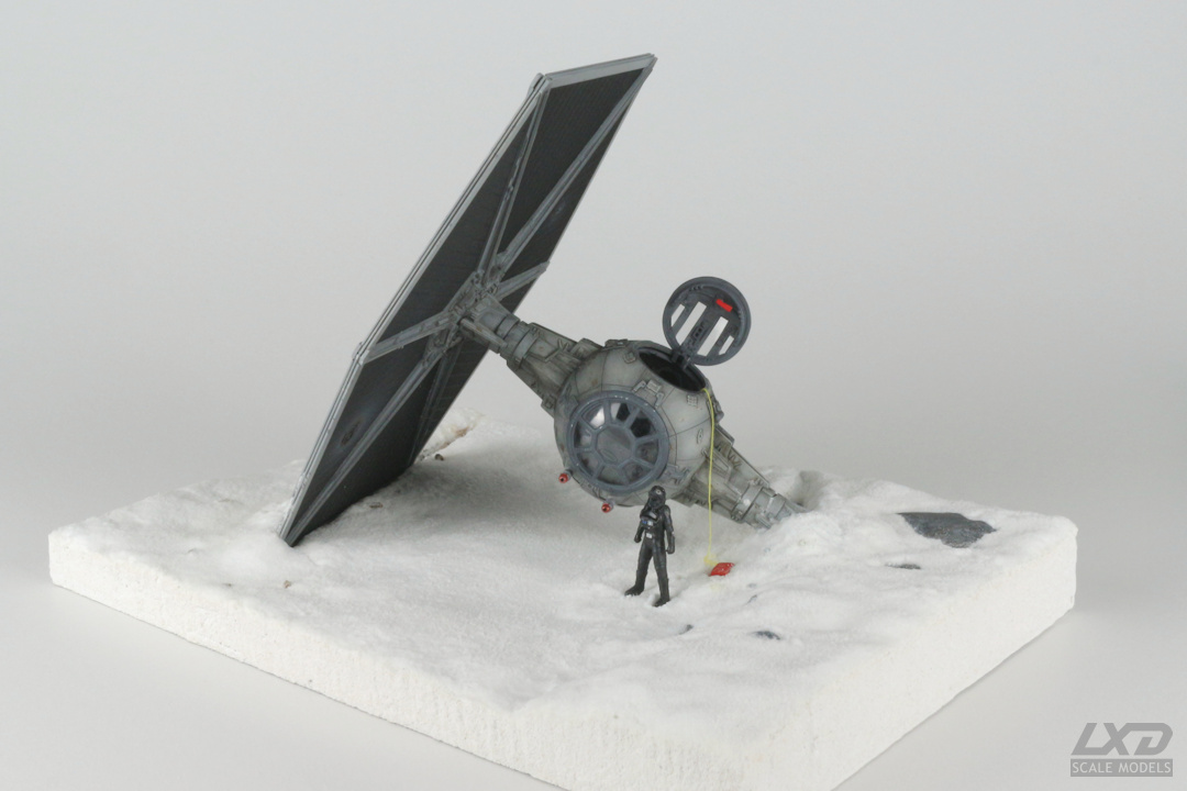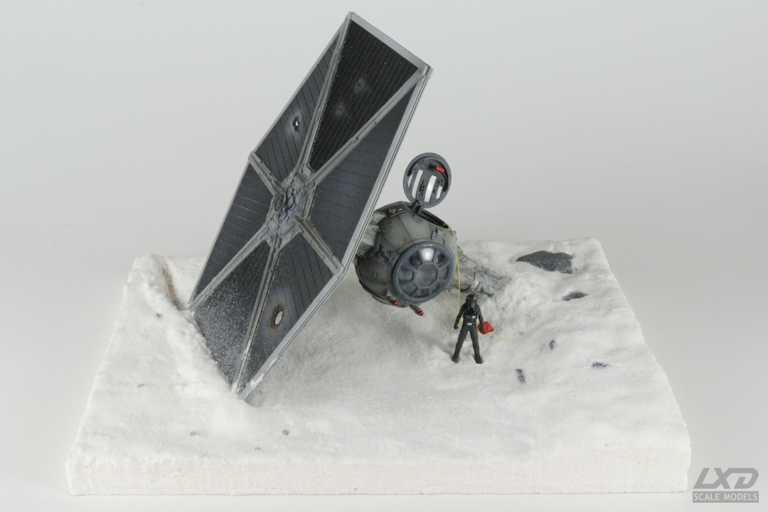 Ein nach heftigem Beschuss abgestürzter TIE Fighter auf einer schneebedeckten Fläche. Der Jäger erhielt mittels verschiedener Weathering-Techniken deutliche Alterungsspuren, die geöffnete Luke eine rote Not-Entriegelung. Mit Bohrer und heißem Nagel wurden Beschuss-Schäden am noch verbliebenen Panel nachgebildet. Die Base besteht aus einer Holzplatte, auf die zunächst mit Strukturpaste die Oberfläche modelliert wurde. Zur Darstellung des Schnees verwendedete ich eine Leimgrundierung, auf die haushaltsübliches Natron gestreut und anschließend mit Klarlack versiegelt wurde.